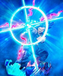 Scolpito in scala 19 cm, Vegito mostra una posa sicura, braccia incrociate e un'aura blu vibrante, fedele al suo stile leggendario.