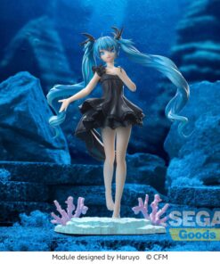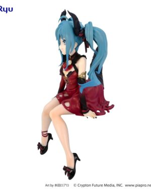 Miku appare qui in una versione raffinata e poetica, con un abito nero in contrasto con calze bianche, nastri delicati e una rosa bianca che le adorna i capelli turchesi. Progettata per stare perfettamente sul bordo di una scatola di noodles istantanei o su uno scaffale, questa statuetta unisce praticità ed estetica.