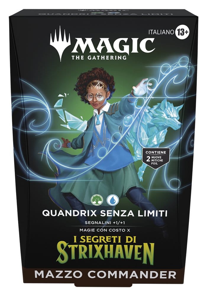 Questo pacchetto include tutti e 5 i mazzi di Magic: The Gathering Secrets of Strixhaven: Silverquill Influence, Prismari Artistry, Witherbloom Pestilence, Lorehold Spirit, Quellerix Unlimited. Ogni mazzo include 1 mazzo da 100 carte Magic (2 carte tradizionali foil senza bordo, 98 carte normali), 10 carte token bifacciali, 1 portamazzo (può contenere 100 carte con bustina protettiva), 1 guida strategica e 1 carta di riferimento.